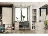 Фасады, выполненные в цвете Ясень Анкор, не имеют ручек, за счет чего мебель кажется легкой и воздушной. Роль ручек выполняют скошенные торцы фасадов.