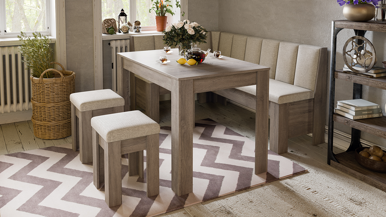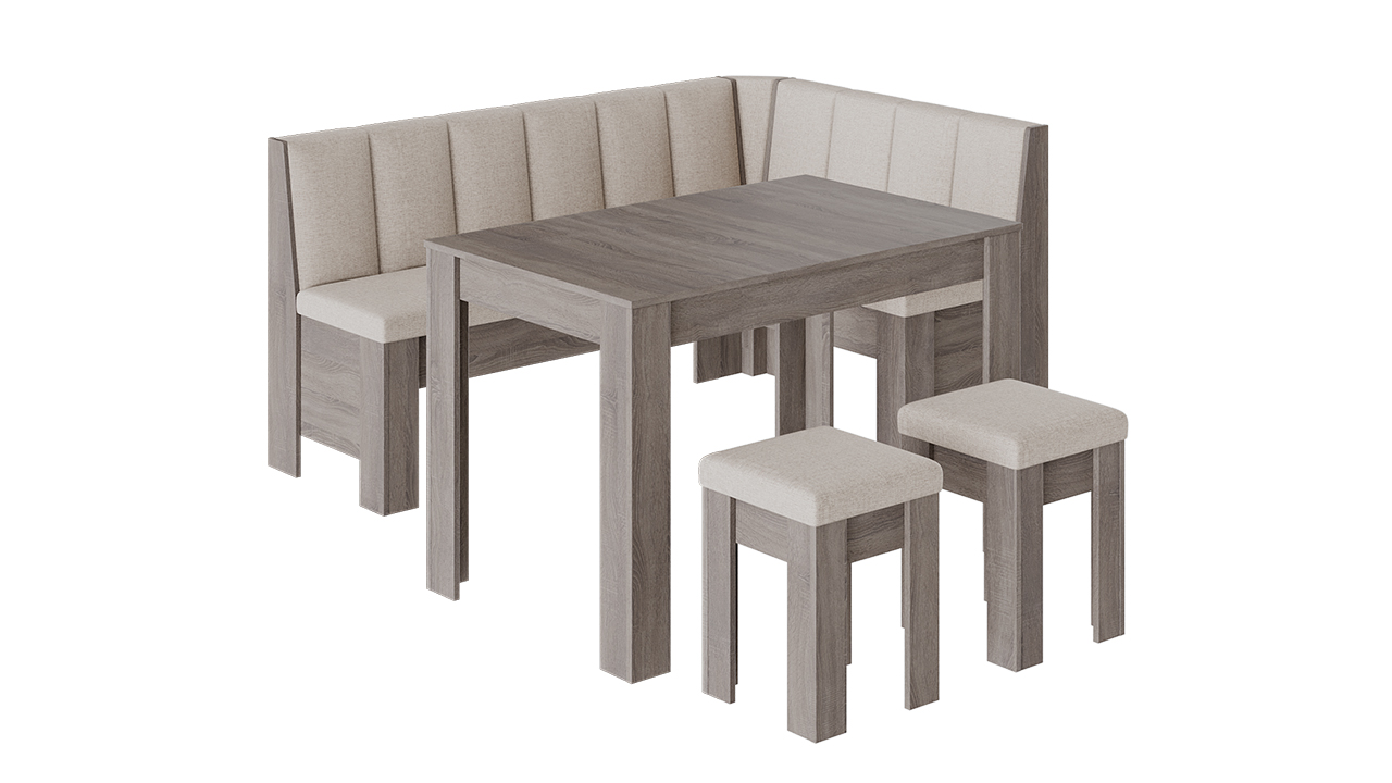 Кухонный уголок «Ганновер» прекрасно подойдёт, если Вы вдумчиво подходите к организации кухонного пространства и стремитесь создать удобную и комфортную обеденную зону. Этот набор мебели создаёт единую композицию, где все элементы идеально сочетаются по цвету и фактуре, но при этом модули можно приобретать по отдельности и совмещать их в набор так, чтобы идеально подходить под потребности конкретного помещения.
