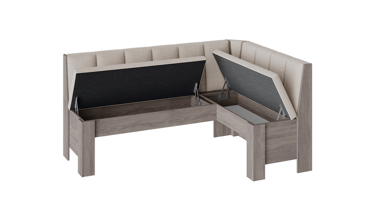 Скамья угловая «Ганновер» имеет места для хранения под сидениями, которые отличаются вместительностью. Поэтому в них можно эффективно разместить все предметы, используемые на кухне, но которые хочется скрыть от лишних глаз. Для того чтобы облегчить процесс открывания, используется подъёмный механизм.