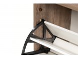 Данная модель обувницы удобна и функциональна в использовании. Конструкцией предусмотрено две закрытых ниши, за откидными дверками которых имеется удобные полочки для обуви. Ручки на створках выполнены из натурального массива дуба. Использование на створках псевдомагнитов позволяет сделать изделие комфортным в использовании. Ножки обувницы, выполнены из массива дерева, регулируются по высоте.