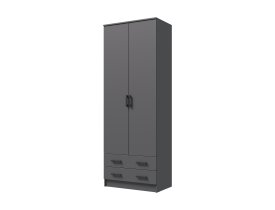 Имеет 3 ящика, зеркальную дверь. Шкаф оснащен металлической перекладиной и полками для одежды.