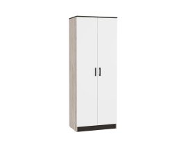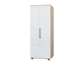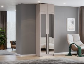 Вместительный двухсекционный шкаф с полками и штангой, имеет две глухих двери. Ручки дверей скрытые.