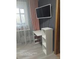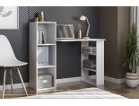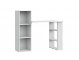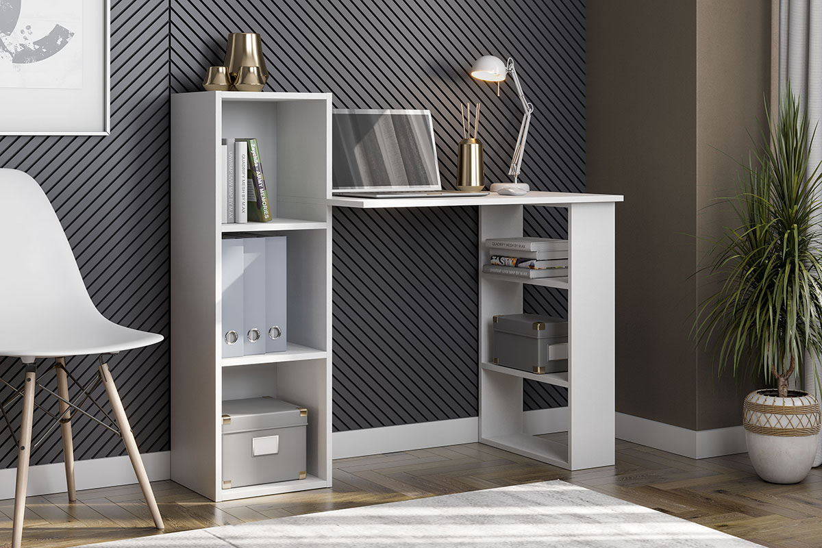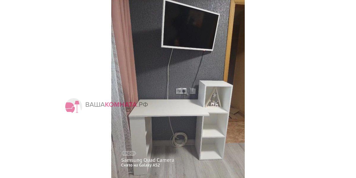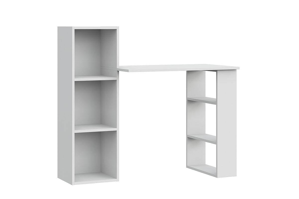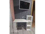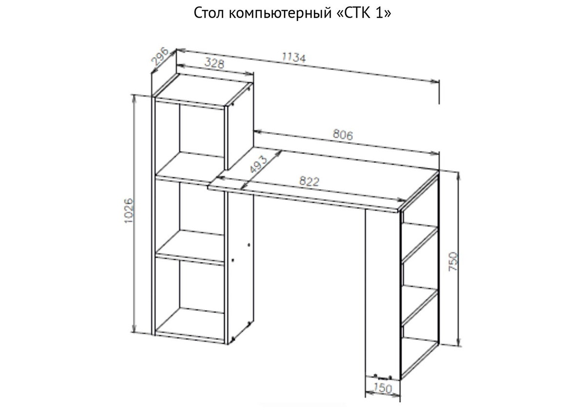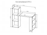 Компактный компьютерный стол «СТК 1» со столешницей размером 822*493 мм. С одной стороны столешница опирается на открытый стеллаж размером 150*734*460 мм с двумя полками. С другой стороны столешница пристыковывается к открытому пеналу размером 328*1026*296 мм также с двумя полками.